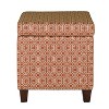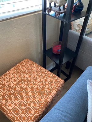 The classic storage cube ottoman is covered in an orange and cream geometric pattern that will brighten up any space. Complemented by wood legs in a dark walnut finish, this square storage ottoman offers fun & functional style. Use it to store pillows or throws in a bedroom, to hide toys or controllers in the family room, or to conceal books or magazines in the living room. Pair two square ottomans together to double the impact. The hinged lid allows easy access to storage within. No assembly required; spot clean as needed. Please note that fabric and wood colors may appear slightly different due to variations in lighting or screen settings.
