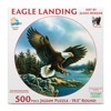 - Eagle Landing is a 500 piece Jigsaw Puzzle by artist James Meger The specialty die cut consists of interlocking pieces and durable construction. The puzzle is guaranteed from manufacturing defects and missing pieces. The finished puzzle has dimensions of 19.5" round