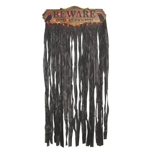Light up the entryway to your Haunted House or Halloween Party with this Scary Door Entry Curtain. Your guests will be warned when they see the ominous crows with LED lit eyes on the faux wood overhang, which reads "Beware Enter At Own Risk" . Featuring Light Up LED lights which operate on a battery and switch, this scary door prop is sure to add to your Halloween Home Decor. With its tattered strips of cloth and weathered faux wood header, this looks like it came from a pirate ship.