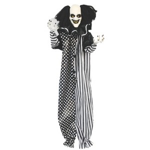 Terrify your neighborhood with this sinister hanging clown decoration. This creepy clown prop will bring nightmares to life. Add extra scareto your haunted carnival scene with this light up clown decoration. This Hanging Light Up Clown features an evil clown with black hair dressed in a polka dot and striped clown suit with ruffled clown collar.