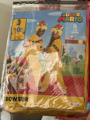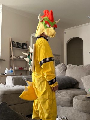 [This review was collected as part of a promotion.] This Bowser character hooded jumpsuit costume in size L 10-12 seems to fit true to size. My son is about 5ft and 81 pounds and it’s a good length in arms and legs for now. He says in a little itchy but thats common with costumes that have velcro and can be fixed by wearing something underneath. The color is vibrant and the shell detail on the back is cool. It attaches by two velcro pieces on top and bottom. The hat/mask is its own piece. Overall a fun costume!