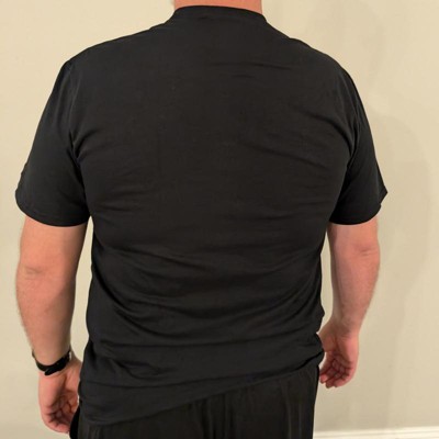 [This review was collected as part of a promotion.] Height 5'10.5". Weight 232. Chest 46.5". Waist 42". Typically wears a 2XL. I ordered a 3XL for a looser fit during his sleep; however, they sent a 2XL in error. Also the funny logo is not centered. Even though this is my husband's typical size, he found the shirt to be loose on him, especially around the waist. This is graphic printed on a Hanes 100% cotton (written on the tag) shirt. So, it's your classic feeling shirt material. It's not soft but durable. Nothing special about it other than the graphic. Love the blue color. I received an incentive to write this review.
