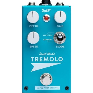 The Analog Harmonic Tremolo effects pedal is an analog stompbox designed to recreate two of the most desirable vacuum-tube based modulation effects found in American amplifiers of the 1960s. The Supro Analog Harmonic Tremolo effects pedal’s AMPLITUDE/HARMONIC switch allows the musician to choose between these distinctly different, vintage effects. AMPLITUDE mode provides the traditional swampy, tremolo sounds generated by bias modulating the power tubes in the original Supro amps. HARMONIC mode provides the psychedelic tones of Leo Fender’s brownface and blonde amps from the early '60s. Supro has implemented Leo’s unique "harmonic tremolo" effect within the output stage of the pedal to create an "amp-like" modulation experience.The Supro Analog Harmonic Tremolo pedal features preamp and power amp sections, with an actual output transformer deployed to recreate the magnetic saturation and coloration of the original vacuum tube based effects found in these historic amps. Along with the standard modulation controls for speed and depth, the Supro 1310 Analog Harmonic Tremolo also features a gain circuit that allows the musician to overdrive the output stage, right where the modulation effects are created. The GAIN control sets the amount of "preamp" gain in the pedal. As turn the gain up, the "power amp" circuit will gradually be pushed into overdrive. This control gives a wide range of sounds from clean to grind, with magnetic saturation occurring as the power section is pushed into overdrive. As crank up the gain, the overall output level of the Supro Analog Harmonic Tremolo effects pedal is automatically compensated in order to maintain consistent signal level. This allows the musician to use the GAIN control to alter the texture of the modulation effects without an overwhelming increase in audio output level.SPEED and DEPTH controls determine the rate and amount of modulation present in the effect. An industry-standard TRS expression pedal can be used to control the speed of the Supro Analog Harmonic Tremolo. When an expression pedal is in use, the onboard SPEED knob is used to set the maximum value. The rate of modulation is indicated by the pulsing LED status indicator. All Supro pedals are assembled in Port Jefferson, NY, USA, featuring custom-tooled, anodized, brushed-aluminum enclosures, 9V battery or AC powered operation, rear-mounted metal jacks, easy-access side-mounted battery drawer and studio-friendly, Noiseless (click-free) true-bypass switching.