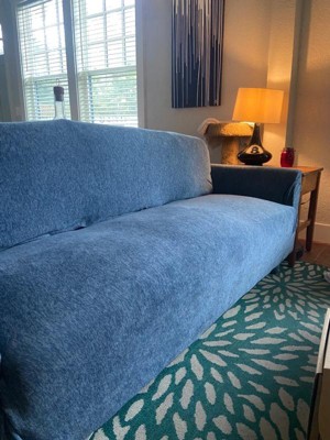 [This review was collected as part of a promotion.] The fabric of this slipcover is soft, stretchy and such a pretty color. The indigo is more of a heather blue, which is a soft, subtle color more capable of blending in with a variety of houses rather than a bold, solid color. The size can be very accommodating, but just be sure to check the measurements as my one couch was too small and the other too large.