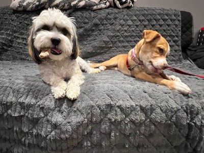 [This review was collected as part of a promotion.] My dogs seem to like it. It’s soft. But it doesn’t work on leather furniture, the back is too slippery for use on leather. Based on the way the back of it feels I imagine it would stay better on fabric furniture. The picture is the result of my dogs sitting on it after less than 15 minutes. It immediately fell down from the back of my leather loveseat. It is big would be best on a sofa/couch.