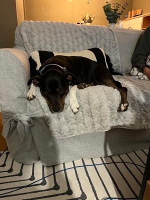 [This review was collected as part of a promotion.] I received this item for free from Influenster in exchange for my honest review. I have 3 dogs and desperately needed something to cover my sofa. This sofa cover is great and does not move much despite the dogs jumping on and off constantly. It is very soft and my dogs really seem to like it!