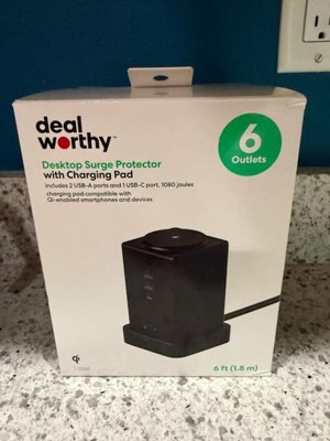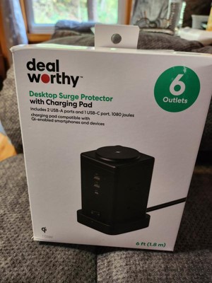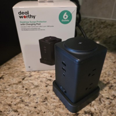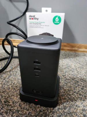 Deal Worthy Desktop Surge Protector Tower with Charging Pad is perfect for plugging in many devices as well as charging! This tower has 2 USB-A ports, 1 USB-C port, 15w wireless charger on top, 6 3-prong plugs and a space saving wall plug. There is also a LED light indicator to let you know it is working properly. This surge protector is also to protect your devices from power loss. It is compact so it can be plugged in anywhere that has a 3-prong outlet. Perfect for traveling too. Highly recommend the Desktop Surge Protector with Charging Pad to keep many devices with power and charging!