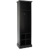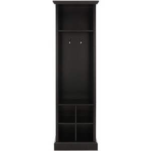 Transform your entryway with the Surrey 6 Shelf 2 Hook Bottom Storage Hall Tree in a sleek black finish. Expertly crafted from wood, this piece combines functionality and style to keep your space organized. The vertical design optimizes space, offering six shelves for all your essentials, from shoes to decorative items. The two hooks provide an easy reach for coats and bags, ensuring everything has its place. Perfect for compact areas, the Surrey hall tree also serves as an elegant addition to any home decor. Enhance your daily routine by choosing a piece that blends practicality with a modern aesthetic. With its versatile design, this hall tree fits seamlessly into any hallway or entry space, making it a must-have for tidy living. Enjoy the convenience and chic charm it brings into your home.
