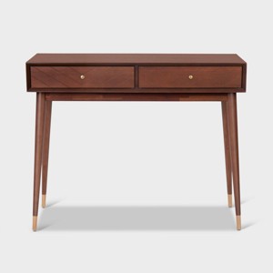 This mid-century modern console table adds easy storage to any room of the house. The slim brass-capped legs bring compelling style to your space and dress up your home in an instant. Two drawers offer storage for your glasses, remotes, or other essentials that deserve a dedicated spot that's easy to get to. Chevron etching decorates the front of the drawer for added interest. The sleek tabletop is large enough for a lamp, framed photos, candles, and other decorative elements. Whether you use this walnut and gold table beside the couch to hold a handy beverage or you place it in the entryway to catch keys and mail, you'll find that this console table offers ample convenience.