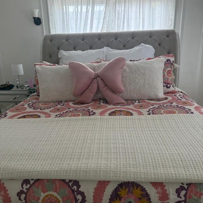 I am obsessed with this print! I feel it is in line with both boho and slightly beachy vibes. It really could go either way with the design and colors. It’s actually surprisingly lightweight without sacrificing warmth. It doesn’t feel heavy when you are using it either, it’s comfortable. I did wash/dry it and ot held up well. It did stay a bit wrinkly after and I feel like it needs a steamer to lay all the way flat. Overall, very happy and it’s so cute with its tie detail on the pillow cases. It fits me queen bed perfectly also.