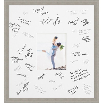 Preserve memories with this conservation-grade signature matboard and handmade frame. Double-thick matboard with a 7 inch width all around the opening holds 50-100 guest signatures and is protected with a UV-resistant sheet of framing acrylic, which shields your signatures and photo from harmful light damage more than traditional glass. Simply open the frame, remove the acrylic, place the mat in the frame for signing in order to assure signatures are fully visible, then replace the acrylic before hanging on the wall. Individually made using traditional custom framing techniques, it has the quality you would expect from your local frame shop and displays your keepsake with premium finishing that can be appreciated up close. BONUS MAT SAMPLE included to test different pens for use prior to signing. Choose pens carefully for fade resistance and the desired look.