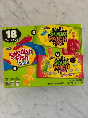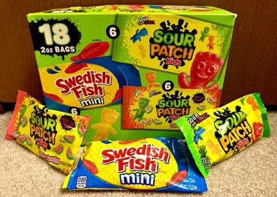 - Includes (6) SOUR PATCH KIDS Original, (6) SOUR PATCH KIDS Watermelon, and (6) SWEDISH FISH Mini bags of candy