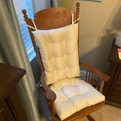 The Sweet Home Collection 2-piece Rocking Chair cushion features tufted construction and a 3" thick padding for soft comfort. The back cushion is reversible with ties on all four corners, while the seat cushion has a non slip backing to keep it in place on your Rocking Chair while you rock on. The cushions are versatile and can be used on Dining Room Chairs!