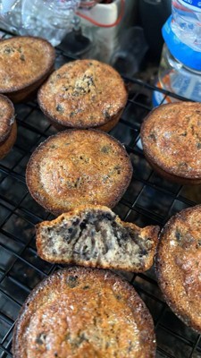 Baked these up had my family try them; they were okay, not the best. When mixed as directed, the batter was very thin; fulled the muffin cups 2/3 full and they didn't rise much during baking (roughly 1in tall after baking). They're sweet, but not cloying, with a good blueberry flavor. It calls for 4 eggs, so use wisely since eggs are outrageously expensive now! Overall, it was an okay mix, but I'm not sure I'd purchase again.