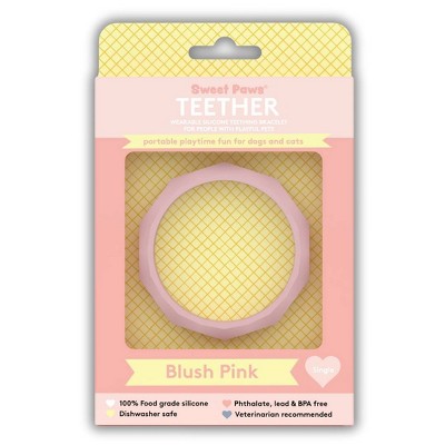 My sweet dog loves the Sweet Paws Silicone Teether Toy for Dogs and Cats in Lavender Cream. This very quickly became her favorite toy! She throws it all around and brings it over for fetch, or just chews it for fun! This teether is durable and dishwasher safe!
