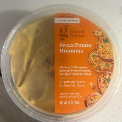 Amazing!!! Not sure why people are saying it doesn’t taste like hummus. It’s SWEET POTATOE hummus so obviously it’s going to taste more like sweet potatoes than hummus!! I picked this up and had it with some carrots for snack today and it’s delicious!!! I’m glad to see this as an option, I’m guessing for the fall. After only seeing plain, garlic, and roasted tomatoe hummus, this was definitely a great change!!! Definitely picking up another one! If you love sweet potatoes, you’ll love this!!