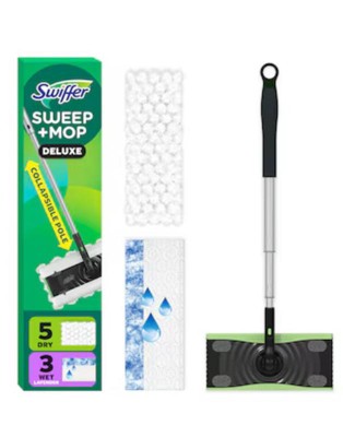 Swiffer Sweep and Mop Deluxe is a 2-in-1 cleaning tool designed for efficient floor cleaning and great for small spaces. This device features a collapsible pole that shrinks to 25 inches for easy storage. The device is more durable* which makes tackling tough messes easy. The locking head enables allows you to clean your baseboards and tight spaces. Start by using a Heavy Duty Sweeping Cloth to capture hair, dirt and dust, then follow with Heavy Duty Mopping Pads to dissolve and trap grime, and trap it away. The combination of sweeping and mopping in one tool simplifies your cleaning routine. Refill cloths are available.*vs Swiffer Sweep and Mop