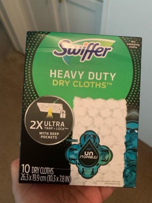 - Enjoy the Lasting Freshness* of Swiffer Heavy Duty Dry Sweeping Cloths with Unstopables Fresh Scent. Swiffer's newest scent is bright and vibrant, finished with airy and crisp undertones.*Leaves behind up to 1 hour of freshness after initial product use