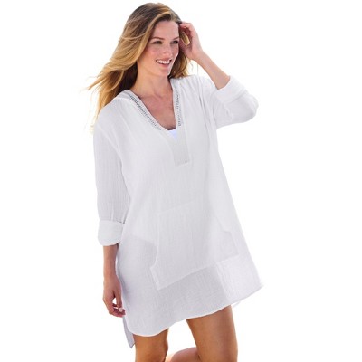 Shield yourself from the sun's rays with this breathable cover-up. Made from a super lightweight cotton gauze material, it has a roomy, oversized fit and is quick-drying, so you can throw it on over a wet suit. Hooded with v-neckline and embroidery detailing. Kangaroo front pocket. Shirred cuffs..