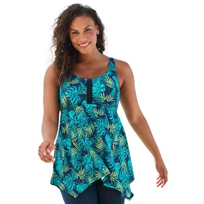 A flattering A-line silhouette on this tankini top lends it a swingy, fun and flowy fit to wear poolisde or for a day by the water. Built-in shelf bra. Adjustable straps.