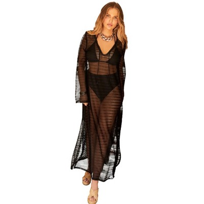 An effortless glam look like this cover up is the move to make for a beach day that goes beyond sunset. It’s crafted from delicately crocheted fabric that has a weight as light as a whisper, with a smattering of sequin-like accents that give it a slight shimmer. Then there’s the plunging V-neckline, flared long sleeves, and a short body skimming silhouette that makes it look absolutely smashing..