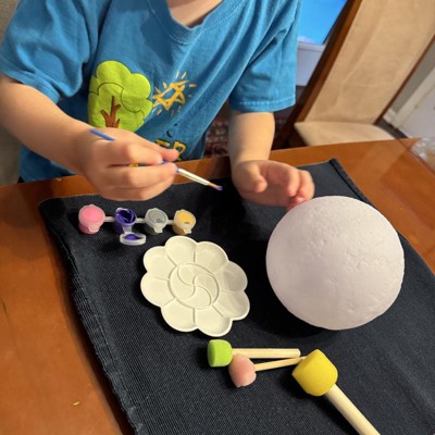 [This review was collected as part of a promotion.] This is a great product for an artsy kid! They recommend 6+ but I think a crafty 5 YO is probably also fine. This is an all in one kit- everything you need is included, including a pallate and 12 paints. The foam tipped sponges were easier to use for this versus the brushes. The only thing missing would be “idiot proof” instructions on how to paint, similar to a pumpkin carving kit. My son really enjoyed this one!!! I received an incentive to write this review.