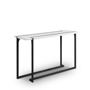 Give your home a modern upgrade with industrial touches when you add this modern two-tone sofa table. This all-new design features a high gloss white top that strikes an eye-catching contrast with the gunmetal-color-finished steel frame and legs that protrude through to the top. If you have a living room or den in need of modern decor, this is the table to accent that space.