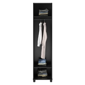 Get organized from the moment you walk in the door with the Camberly 18" Mudroom Cabinet by Systembuild Evolution. Made of laminated particleboard with a sleek black finish, the Camberly Mudroom Cabinet is both attractive and affordable. The interior of this Cabinet features 1 lower adjustable shelf for shoes or bins, a middle shelf perfect for backpacks or purses, a coat rack, and an upper shelf for hats, gloves and other essentials. Perfect for back to school to keep coats and backpacks in one place for a smooth, no fuss morning routine. Limited space? The Camberly Mudroom Cabinet works great in the garage or basement as well. With adjustable feet, keeping your Cabinet level on uneven floors is simple. A wall anchor kit is included to secure the Cabinet to the wall and prevent tipping injuries. Use this piece as a stand-alone item, or combine it with additional Systembuild Evolution Camberly storage items to create the perfect storage solution for your home. The Wide Mudroom Cabinet ships flat to your door and 2 adults are recommended to assemble. Once assembled, the Cabinet measures to be 18.23" W x 15.4" D x 74.25" H.