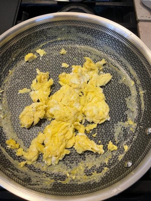 [This review was collected as part of a promotion.] This T-fal hybridMesh stainless steel 10.5 inch pan is a nice pan to cook anything but remember it’s stainless steel hybrid not nonstick so if you don’t know how to cook you will be upset and complain. You need to heat up pan first with some butter or oil to cook properly. The eggs do stick a little but like in a stainless steel pan but again with proper butter or oil once it’s cooked to a certain point it’s easy to release. This pan heat up fast and I don’t find it has any uneven cooking zones. It’s well built and have a good weight. To me it’s not heavy but it’s not light either. It’s basically t-fall stainless steel pan with hexclad cooking surface. Cleaning is really easy you don’t need to scrub it a lot. I like this pan.
