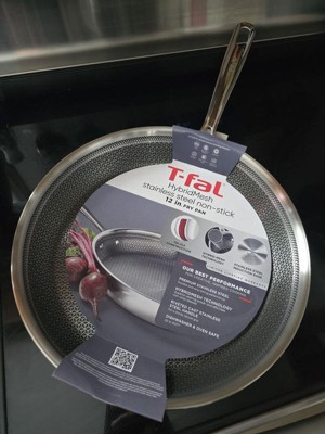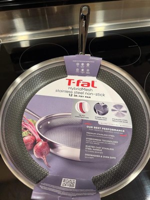 [This review was collected as part of a promotion.] The T-fal HybridMesh stainless steel non-stick 12 in fry pan is innovative. Though it evenly distributes heat throughout the fry pan, it did not live up to my expectations. It’s not optimally non stick as some food does stick.