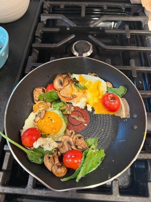 [This review was collected as part of a promotion.] This pan is lightweight and I love the heat indicator in the middle that lets you know when the pan has heated up. I have been cooking with it for a few days now and I’ve noticed my eggs stick with my normal amount of oil (I cook with avacado oil). Compared to my other pans I have to put a bit more oil in this pan to prevent sticking (that’s why I knocked 1 star). Other than that it’s an awesome little pan. I also love the pouring indents so when I cook a sauce it will be mess free.