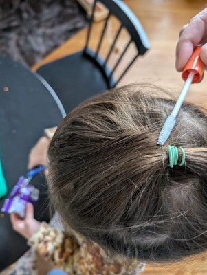 My daughter has fine hair with lots of little baby hairs that naturally stick up as they’re growing. I don’t always want to use hair spray or gel so was excited to try this. Not sure what to expect, but wow, it worked really well! The wand was easy to use and it held the hair down after a few passes almost immediately. I used it after finishing her hair style and want to note, although the wand is great for application, because it is a wand, it did lightly pull at some hair that was secured in the pony tail, and I had to readjust a bit. Not surprisingly as it is a brush with bristles, but wanted to note that. In the photos I’m going to post you’ll see before and after use.