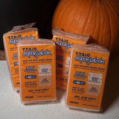 The T.Taio Esponjabon, Salicylic Acid Anti-Acne Soap Sponge, is a unique soap infused sponge. It is a 2-in-1 product that features soap on the outside and a soft sponge on the inside. The soap sponge cleanses and gently exfoliates the skin at the same time. The Salicylic Acid formula is for an anti-acne effect that helps control acne and oily skin. Esponjabon is clinically tested and can be used daily during skincare routines or shower routines and lasts over 40 uses. Use the T.Taio Esponjabon, Salicylic Acid Anti-Acne Soap Sponge, to wash the face or body by applying it directly to the skin or for more delicate skin, by lathering in between the hands and applying the cleansing foam.