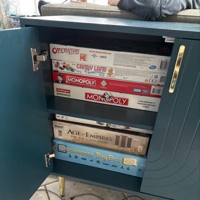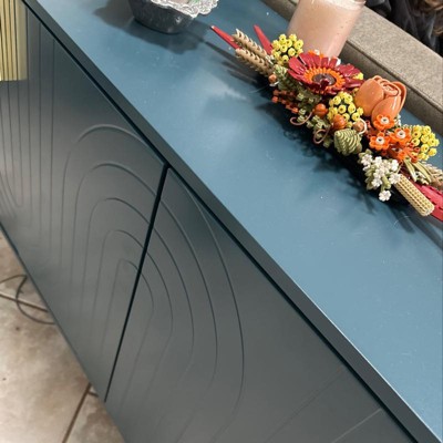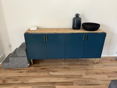 Beautiful, muted teal, looks expensive but wasn't. I put together in an hour by myself. I used a hole saw to cut a hole in the back for cords since we're using it as a TV cabinet. It's more muted than the pic which I actually prefer. The legs have little adjustable ends to help balance it out. Tons of room for storage - definitely recommend!