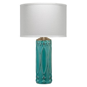 Equal parts classic and contemporary, this table lamp brings a versatile style to any tabletop. Crafted by skilled artisans of ceramic, this lamp features an intricate detailed pattern across a slender column. Glazed in a bold turquoise color and topped with a linen shade for soft contrast and refined glow. While no two will look exactly the same, the slight variations make this lamp a statement piece in any tabletop.