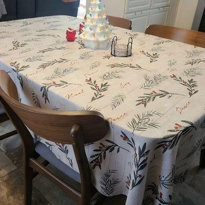 - ● Festive Holiday Design: Boasts a shiplap aesthetic with pine needles, branches, berries, and holiday wording on an ivory ground, perfectly blending fall decor, Thanksgiving, and Christmas tablecloth charm for seasonal ambiance.