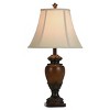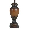 - This table lamp features a full traditional urn shaped body that has a brown wood finish.