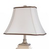Eye-catching details make this beige table lamp a radiant addition to a bedroom, office, or hallway. Also beautiful in a dining room or living room, this lamp includes a tapered white fabric shade with dark ribbon accents along the top and bottom. The frame has a cream crackle finish with darker tones at the base and neck.