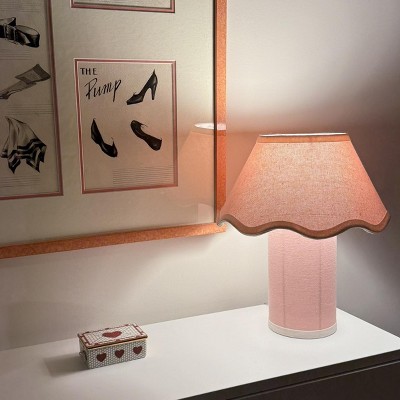 Add a charming accent to any room with this Fabric Base with Fabric Shade Table Lamp from Threshold™ designed with Studio McGee. Featuring a pink fabric base paired with a scalloped drum shade with white detailing, this table lamp brings a sweet touch to nightstands, dressers, or side tables. The inline cord rocker switch offers easy on/off control, while the five-foot cord allows for versatile placement.