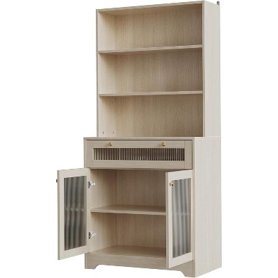 - Elevate your space with warm, rustic charm that complements both traditional and modern styles. The combination of natural wood finishes, glass-front doors, and mixed shelving creates an inviting focal point that adds character and sophistication to any room.