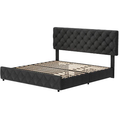 TackView Bed Frame with Upholstered Headboard,Wooden Platform Bed Frame with 2 Storage Pockets,Vertical Channel Tufted Wingback