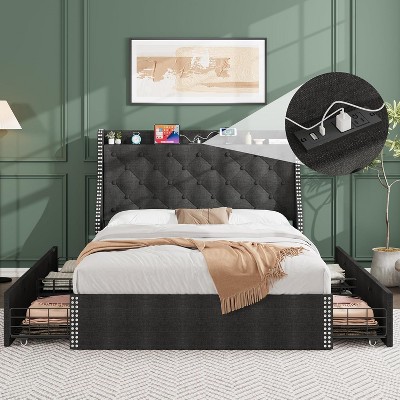 Transform your bedroom with this elegant full-size platform bed, combining luxurious linen upholstery with smart storage solutions for a perfect blend of style and function. The adjustable linen headboard (39.4"-45.7" height) features high-density sponge padding for plush comfort and accommodates 8-12" mattresses, while its button-tufted design adds a touch of sophistication to any decor. Four spacious wire-mesh drawers (27.2"L x 19.7"W x 5.3"H) with smooth rollers provide convenient under-bed storage for bedding, clothing, or accessories while making cleaning effortless. Built for ultimate durability, the 12 wooden slat support system holds up to 1000 lbs, and EVA sponge strips ensure a quiet, creak-free sleep. With easy-to-follow assembly instructions and all parts included in one package—plus 24-hour customer support—this breathable, skin-friendly bed delivers premium comfort, generous organization space, and lasting stability in one stylish package, perfect for creating your dream bedroom retreat.