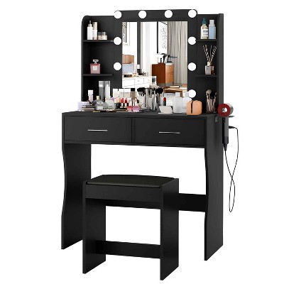 TackView Vanity Table with Lights and Mirror, Table with Power Strip, USB Charging, Hair Dryer Holder and Stool for Bedroom