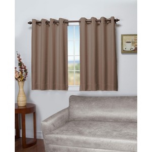 The solid blackout grommet curtain panel features a casual handsome face fabric woven with a layer of black yarns sandwiched between two layers of colored yarn,plusa separate liner that is also woven with black-out yarns. The panel drapes beautifully while providing unbeatable protection from the harsh outside light. Adel Solid Blackout Thermal Grommet Single Curtain Panel saves energy, provides privacy, creates an air barrier for extra insulation to keep out the cold and helps to protect the room from drafts. These 50” wide panels are available in 63” 84” and 96” lengths. Additional features include a 4" bottom hems, 1" side hems, and weighted corners. The curtain slides easily through the 1.5" diameter opening in the metal grommets, using a curtain rod up to 1.25" in diameter.Available in 5 colors: Woodland Green, Driftwood, and Floral Rose come with antique bronze grommet finish and Parchment and Stone has brush nickel grommet finish.
