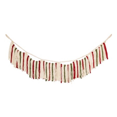 Felt triangles are connected with twisted red and white yarn. Brown twine loop at the top for hanging.