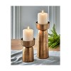 Knoll Tall Pillar Candle Holder is made of high-quality aluminum with an antique brass finish measuring 10 inches in height and 4 inches in length and width, designed to hold pillars up to 3 inches in diameter.