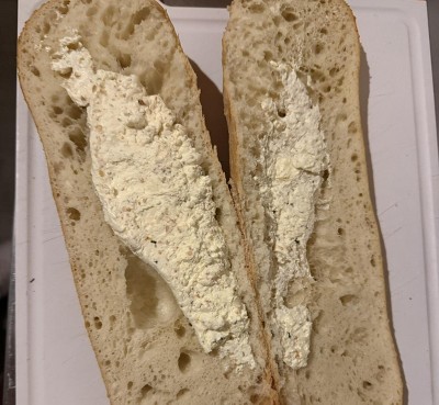 First time and last time. Just one blob of garbage garlic “butter” I also had to get rid of a ridiculous amount of flour from the bottom of the bread or else I would just be eating raw flour