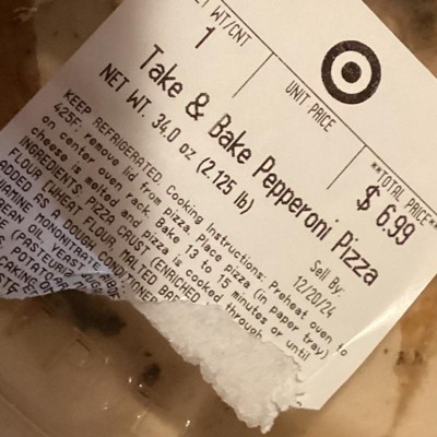 This 34-Ounce Take & Bake Pepperoni Pizza is a perfect solution for nights when you just don't have time to cook dinner from scratch. This delicious ready-to-bake pepperoni pizza gives you pizzeria-quality taste with the ease and convenience of your home oven. Enjoy it as prepped, or customize by adding your own ingredients at home to include your favorite toppings. To cook, simply preheat the oven to 425 degrees, remove the lid from the pizza, place it in the paper tray on the center oven rack and bake for 13 to 15 minutes or until cheese is melted and pizza is cooked through.