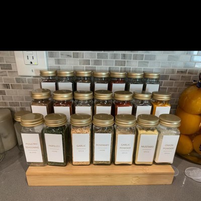 Talented Kitchen 24 Pack Glass Spice Bottles with 284 Preprinted Label Stickers, 4 oz Empty Square Seasoning Jars with Shaker Lids & Gold Caps