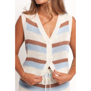 Featuring a breathable crochet knit and a trendy tan and blue multi-stripe pattern, this sleeveless piece is perfect for layering or wearing on its own during warmer days. The flattering V neckline and functional button-down front make it easy and versatile to style.